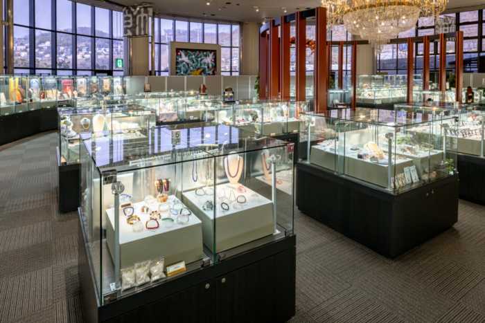- かいてらす(山梨県地場産業センター)では「光」「蔵」「味」「匠」の4つのコーナーを中心に山梨を代表する特産品、工芸品をご案内・販売をしております。 豪華に輝くシャンデリアの下、日本一のジュエリー産地山梨が誇る宝飾品、リング、ネックレス、ブローチ、イヤリングなど約6,000点を展示販売。 また現代の名工やジュエリーマスターの作品など優れた商品を多数展示販売しております。